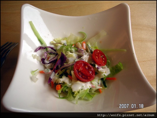 再來是沙拉, 簡單的蔬菜加上優酪乳的醬, 一樣沒什麼味道= =+