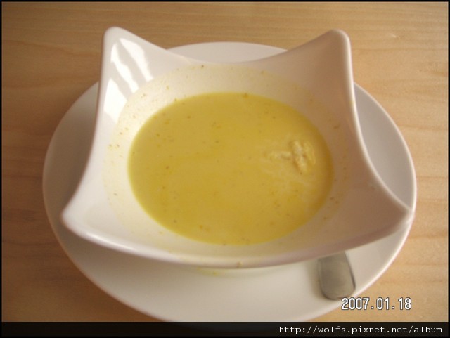 先送來的是 南瓜湯, 清清如水的湯, 沒有什麼南瓜味, 更別說有什麼顆粒了, 連味道都很淡....