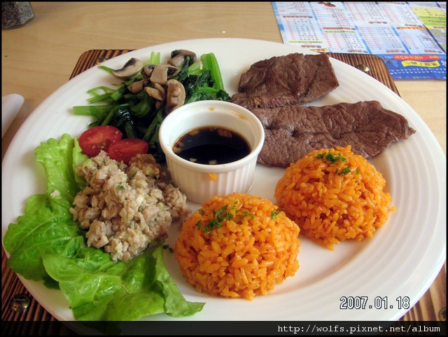 聽了老闆娘的介紹跟推薦後, 我們都點了-關島查莫洛餐-我選了牛肉, Jason選了肋排.