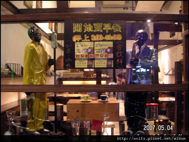 以Jazz為主調的咖啡店, 門口櫥窗裡是Louis Armstrong跟另一個認不出是誰的樂手的人偶.